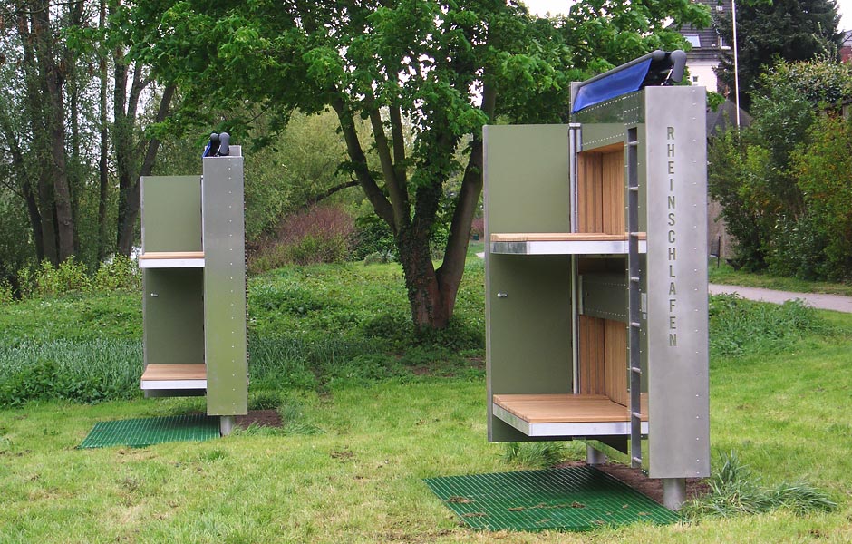 2 Wandscheiben aus genieteten Alublechen sowie geflochtenen Weidenruten zwischen stark frequentiertem Radwanderweg und dem Rheinufer. Herausklappbare Liegen bieten Schlafgelegenheiten unter freiem Himmel mit Blick auf den Drachenfels.